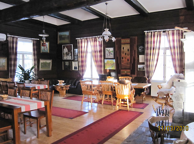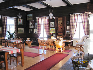The spacious living room has many cozy places to chat and long tables to seat several people. |
